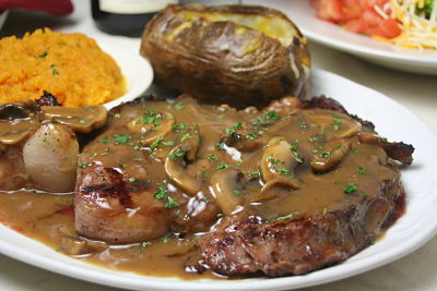 Carne principal a elegir: pollo en salsa blanca con hongos, chuletas de cerdo en salsa agridulce, o carne en salsa. Estación buffet con barra de ensaladas. Guarniciones (arroz, frijoles, picadillo, plátanos maduros en almíbar, vegetales al vapor).